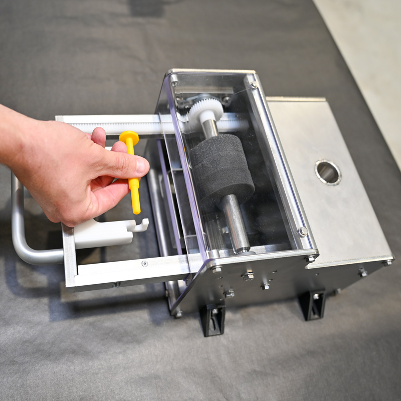 SPECIGONE a retenu pour cette fonction une technique de tiroir va et vient qui actionne des roues dentées sur des axes équipés de mousses souples. Ces mousses sont imbibées de silicone qui, lorsque la tige rentre en contact avec elle, viennent déposer la quantité voulue de produit.